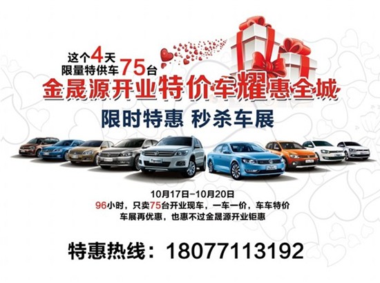 10月17日-20日,金晟源將于展廳舉行開業(yè)特價車限時特惠活動,車展月月有,開業(yè)鉅惠僅此一次。75臺開業(yè)現(xiàn)車資源保證讓您爽購愛車!一車一價,車車特價,目前已有客戶開始搶訂,預(yù)約從速!活動詳詢:18077113192