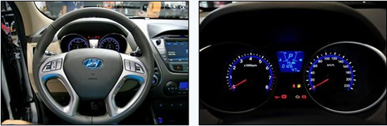 現(xiàn)代iX35的內(nèi)飾配色風(fēng)格有深淺兩種配色,而其標(biāo)新立異的X型中控臺造型在淺色內(nèi)飾的中控臺上看著比較明顯。ix35采用的是一款手感非常不錯(cuò)的四幅式多功能方向盤,無論是樣式還是色彩的搭配都顯得非常時(shí)尚動感。炮筒式的儀表盤樣式設(shè)計(jì)并不算新穎,但表盤上藍(lán)白色的顏色搭配還是使儀表盤上的讀數(shù)變得更加清晰易讀。