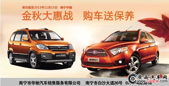 對“金秋大惠戰(zhàn) 購車送保養(yǎng)”感興趣的朋友可以到白沙大道26號(白沙店)、安吉大道36號(天吉店)進(jìn)店了解活動(dòng)和賞車試駕,也可以致電0771-4923818咨詢專業(yè)銷售顧問,南寧華馳4S店秉承服務(wù)宗旨:我的服務(wù),為您滿意!