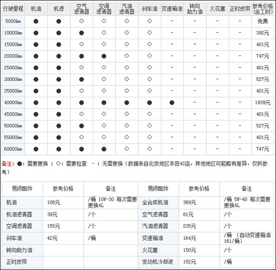 花冠EX 1.6L自動(dòng)擋保養(yǎng)費(fèi)用參考