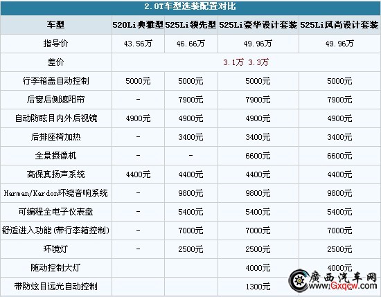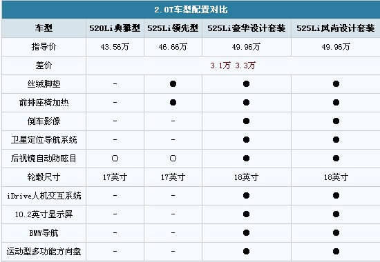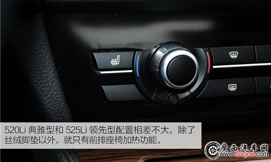 在配置方面,520Li典雅型和525Li領(lǐng)先型相差不大,除了絲絨腳墊以外,就只有前排座椅加熱功能,其它配置都一樣。簡(jiǎn)而言之,這兩款車型配置上的差異基本可以忽略。