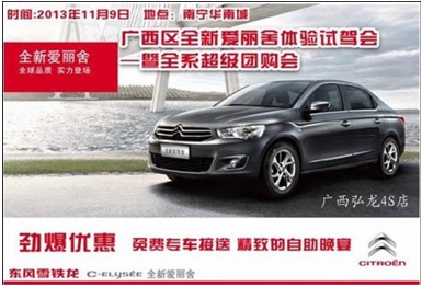 東風(fēng)雪鐵龍將于2013年11月9日南寧華南城舉行“廣西區(qū)全新愛(ài)麗舍上市會(huì)暨全系團(tuán)購(gòu)會(huì)”,更有精致茶歇、抽獎(jiǎng)活動(dòng),讓您擁有無(wú)以倫比的購(gòu)車(chē)體驗(yàn),一起組團(tuán)參加“超級(jí)團(tuán),馬上購(gòu)”!東風(fēng)雪鐵龍全系現(xiàn)車(chē)明碼標(biāo)價(jià),誠(chéng)意開(kāi)賣(mài)!