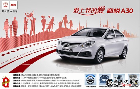 2013年11月2日,江淮二代乘用車的首款家轎產(chǎn)品——和悅A30在青島海泉灣盛裝上市,以和悅A30擔(dān)綱的和悅飛行秀第四季也正式啟動(dòng)。和悅A30是一款定位于新生代消費(fèi)群的緊湊型家庭用車,售價(jià)區(qū)間為6.28萬(wàn)-8.28萬(wàn)。繼一季度推出瑞風(fēng)S5之后,和悅A30的上市,標(biāo)志著江淮乘用車2.0時(shí)代的大幕正式拉開(kāi)。