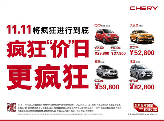 奇瑞汽車邀您約惠單身節(jié)讓利狂潮,為您重磅呈現(xiàn)11.11瘋狂購車節(jié)!QQ、風(fēng)云2、E5、瑞虎,四款經(jīng)典車型全系鉅惠,在瘋狂“價”日總額高達(dá)3億優(yōu)惠基礎(chǔ)上,再度重磅加碼!活動當(dāng)天購車,任您勁享瘋狂底價!不僅如此,更有巨匠之制艾瑞澤7和實(shí)尚家轎E3火熱到店,與您共襄瘋狂盛惠!還有萬眾期待的神秘禮遇,力圖將瘋狂讓利進(jìn)行到底!一年僅此一次的瘋狂讓利,比瘋狂更瘋狂的“價”日狂歡,您,怎容錯失?!
