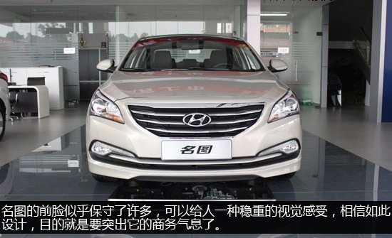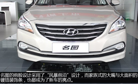 名圖的前臉設(shè)計采用的是與新勝達(dá)一樣的“風(fēng)暴前沿”設(shè)計,這個大嘴造型儼然已成為了北京現(xiàn)代的家族設(shè)計了,而且名圖采用了大面積的鍍鉻裝飾條,這也正對國人胃口。