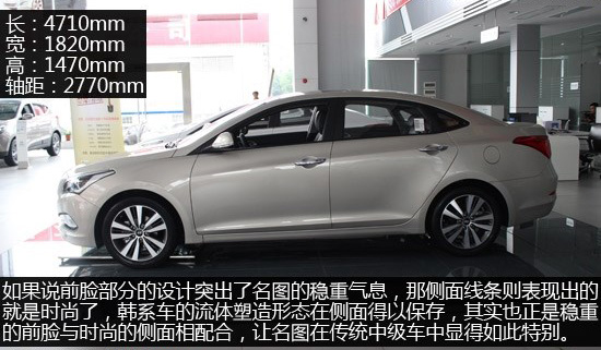 如果說前臉部分的設(shè)計突出了名圖的穩(wěn)重氣息,那它的側(cè)面線條則表現(xiàn)出的就是時尚了,韓系車的流體塑造形態(tài)在側(cè)面得以保存,其實也正是穩(wěn)重的前臉與時尚的側(cè)面相配合,才讓名圖在傳統(tǒng)商務(wù)中級車中顯得如此特別;另外名圖的長寬高達(dá)到了4710mm/1820mm/1470mm,軸距則達(dá)到了2770mm。