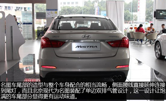 名圖車尾部的造型與整個車身配合的相當(dāng)流暢,側(cè)面腰線直接延伸連接到尾燈,而且北京現(xiàn)代為名圖裝配了單邊雙排氣管設(shè)計,這一設(shè)計讓飽滿的車尾部分顯得更有運(yùn)動味道,不過在低配車型中并無此項配置。