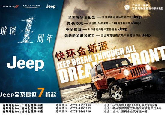 克萊斯勒J(rèn)eep快環(huán)金斯源4S店即將迎來(lái)一周歲的生日,在開業(yè)未到一年的時(shí)間里,廣西金斯源店就榮獲了克萊斯勒在廣西唯一星級(jí)經(jīng)銷店的光榮稱號(hào),能獲此殊榮全賴廣大新老車主的支持與厚愛,為了回饋新老客戶,賀柳州金斯源店開業(yè),快環(huán)金斯源店特別推出了周年鉅惠提前享活動(dòng),不僅推出全進(jìn)口SUV購(gòu)車最低7折起,更為老客戶準(zhǔn)備了豐盛的愛車養(yǎng)護(hù)大餐。