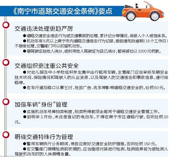 解讀:此項規(guī)定是配合電動車上牌進度而設定的。目前,南寧市區(qū)交通的客觀條件不適合電動車任意行駛,但此規(guī)定實施后,上牌的電動車可在市區(qū)道路行駛,未上牌或外地的電動車不能在市區(qū)道路行駛。