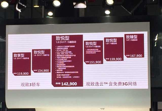 (廣西汽車網(wǎng) 訊)11月21日,觀致3在廣州車展正式上市,觀致3將搭載1.6L和1.6T兩款動(dòng)力,共推出6款車型,配置上也非常有看點(diǎn),售價(jià)區(qū)間為11.99-16.79萬元,具體車型售價(jià)如下表所示: