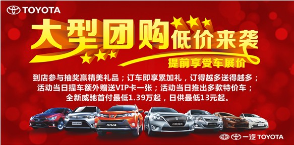 (廣西汽車網(wǎng) 訊)為回饋廣大車友,南寧天下行一汽豐田11月30日(周六)開展史上最大優(yōu)惠的大型團購活動——提前享車展價大型團購活動,讓您真正享受到購車優(yōu)惠!
