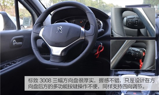 野帝采用真皮四幅方向盤(pán),手感雖然沒(méi)有標(biāo)致3008那么厚實(shí),但是集成的多功能按鍵操作方便,靈敏也更高。另外,兩車(chē)方向盤(pán)都支持四向調(diào)節(jié)。