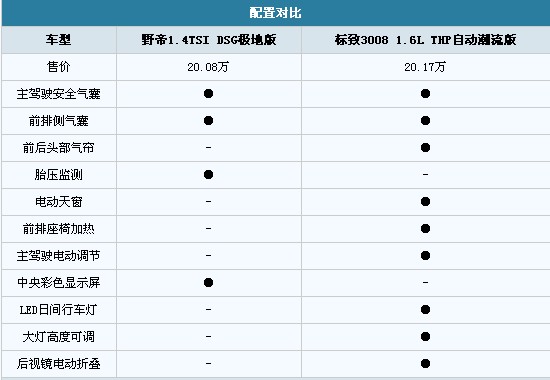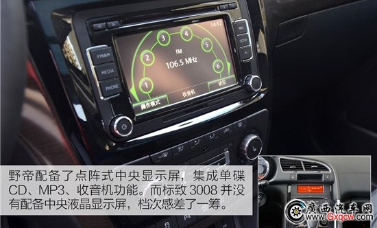 野帝配備了點(diǎn)陣式中央顯示屏,集成單碟CD、MP3、收音機(jī)功能,不過(guò)沒(méi)有GPS導(dǎo)航,需要的朋友可以選裝獲得。而標(biāo)致3008并沒(méi)有配備中央液晶顯示屏,檔次感差了一籌。