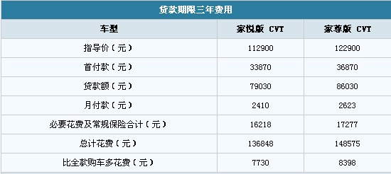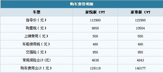 首先我們來看看全款購車需要多少費用。以推薦的家悅版和家尊版的CVT車型為例,購車費用明細(xì)如下: