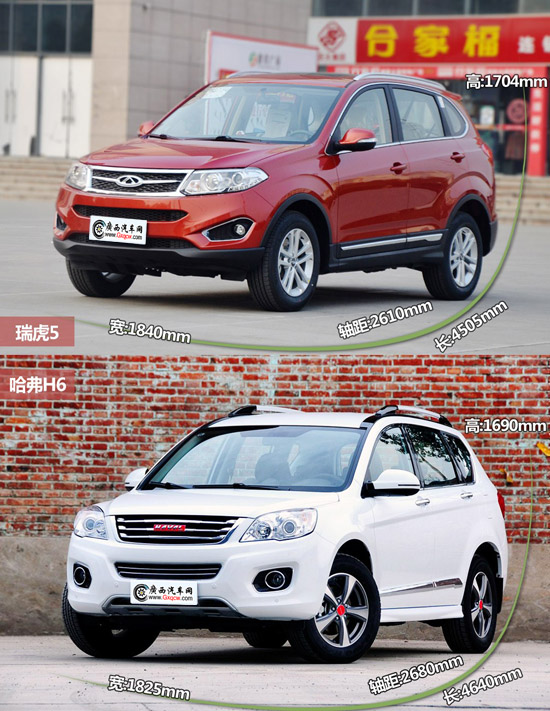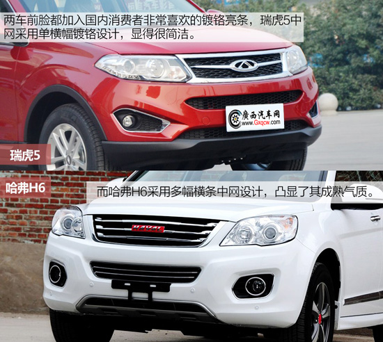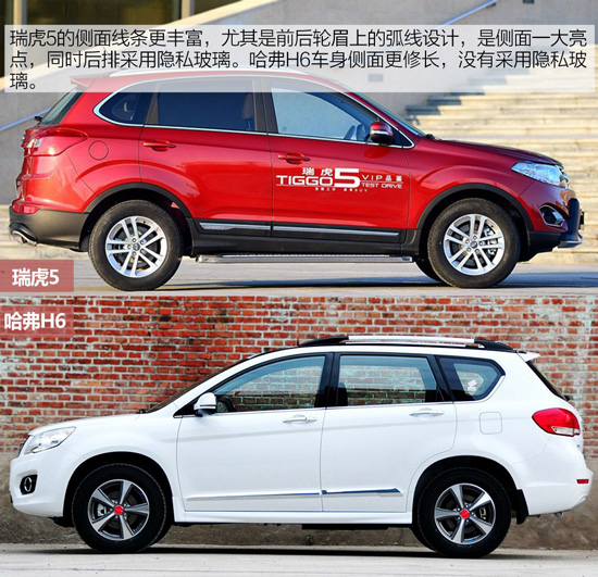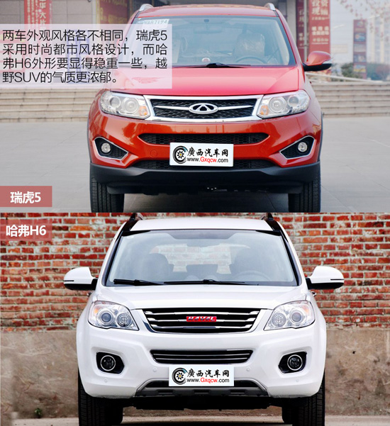 兩車都表現(xiàn)出不同的外觀風(fēng)格,瑞虎5采用時(shí)尚都市風(fēng)格,整車給人感覺動(dòng)感、時(shí)尚,飽滿圓潤(rùn)的車身線條塑造了標(biāo)準(zhǔn)的"城市SUV"形象。而相比之下,哈弗H6外形要顯得穩(wěn)重一些,給人很有力量的感覺,車身線條也更為平直,越野SUV的氣質(zhì)更濃郁。