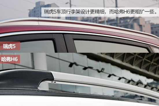 從側(cè)面看,瑞虎5的側(cè)面線條更豐富,尤其是前后輪眉上的弧線設(shè)計(jì),是側(cè)面一大亮點(diǎn)。哈弗H6車身更修長(zhǎng),而加大的尾部三角窗對(duì)提升后排視野有一定的幫助。兩車都配備車頂行李架,不過瑞虎5設(shè)計(jì)更精細(xì),而哈弗H6更粗獷一些。另外,瑞虎5采用后排隱私玻璃,而哈弗H6沒有。