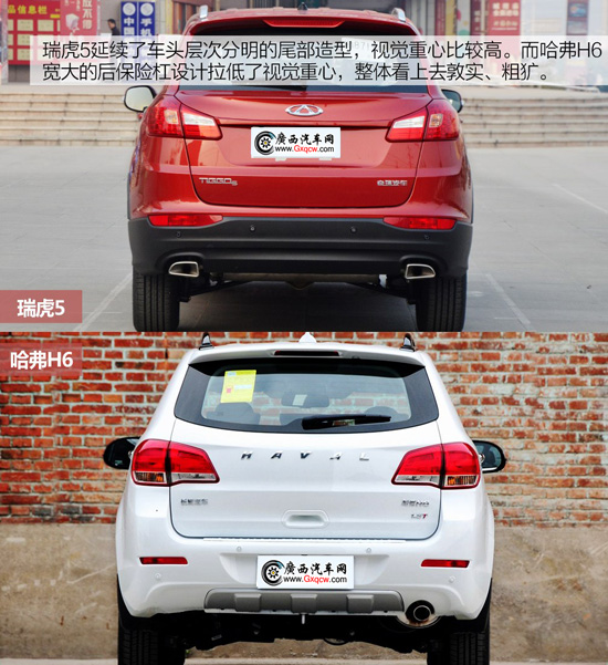 尾部造型,瑞虎5延續(xù)了車頭層次分明的造型,視覺重心比較高,因此顯得高大。而哈弗H6寬大的后保險(xiǎn)杠設(shè)計(jì)拉低了視覺重心,整體看上去敦實(shí)、粗獷。