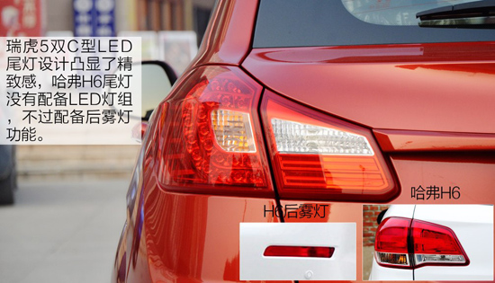 瑞虎5后尾燈加入了LED燈組,雙C型設(shè)計(jì)凸顯了精致感,而哈弗H6尾燈沒有配備LED燈組,內(nèi)部設(shè)計(jì)也比較普通。不過哈弗H6配備后霧燈彌補(bǔ)了一些不足。