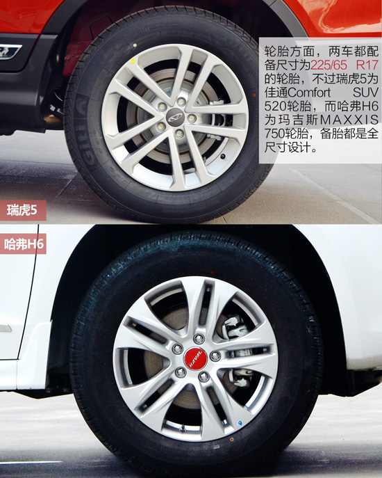 輪胎方面,兩車都配備尺寸為225/65 R17的輪胎,不過瑞虎5為佳通Comfort SUV 520輪胎,而哈弗H6為瑪吉斯MAXXIS 750輪胎,備胎都是全尺寸設(shè)計(jì)。