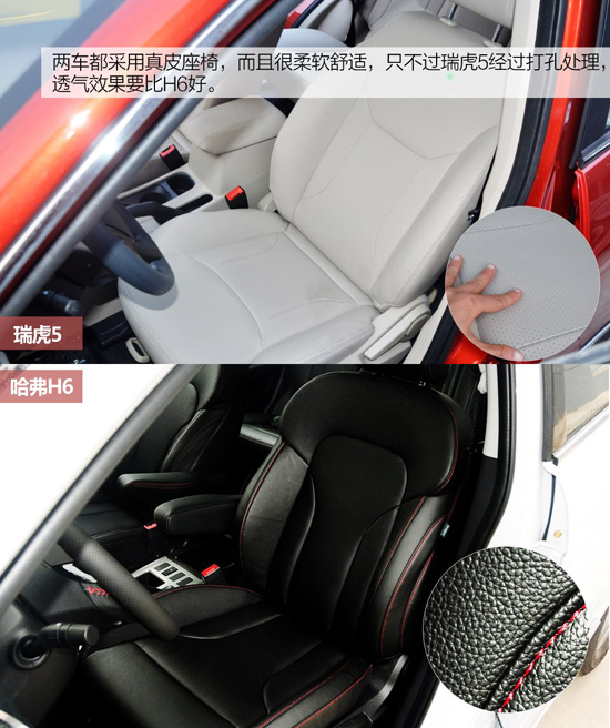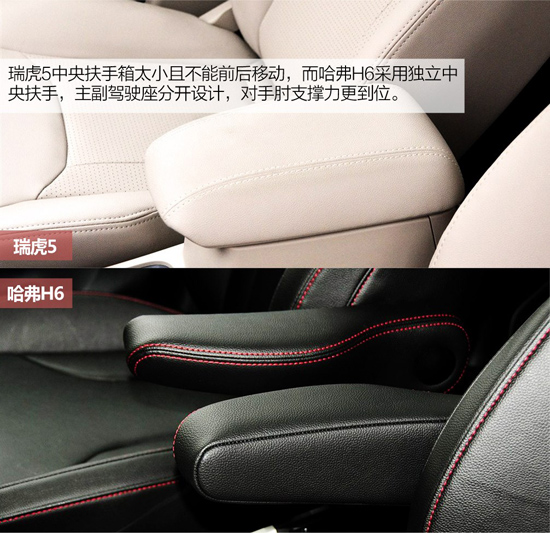 兩車都采用真皮座椅,而且很柔軟舒適,只不過瑞虎5經(jīng)過打孔處理,透氣效果要比H6好。另外,瑞虎5主駕駛座為電動(dòng)6向調(diào)節(jié),而H6為手動(dòng)6向調(diào)節(jié)。不過唯一不足是瑞虎5中央扶手箱太小且不能前后移動(dòng),而哈弗H6采用獨(dú)立中央扶手,主副駕駛座分開設(shè)計(jì),對手肘支撐力更到位。