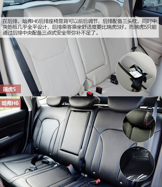 在后排,哈弗H6后排座椅靠背可以前后調(diào)節(jié),后排配備三頭枕,同時(shí)中央地板幾乎全平設(shè)計(jì),后排乘客乘坐舒適度要比瑞虎5好。而瑞虎5只能通過后排中央配備三點(diǎn)式安全帶彌補(bǔ)不足了。