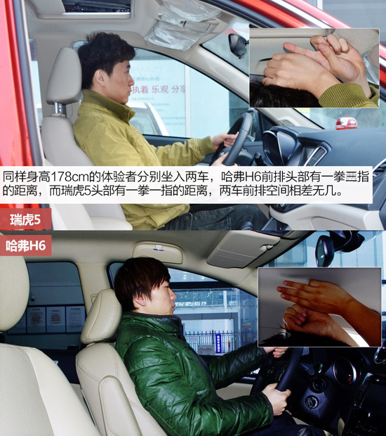 空間方面,同樣身高178cm的體驗(yàn)者分別坐入兩車,哈弗H6前排頭部有一拳兩指的距離,而瑞虎5頭部有一拳一指的距離,兩車前排空間相差無幾。不過坐姿有所不同,瑞虎5坐姿更高,視野更好,而哈弗H6坐姿相對低矮一些,接近轎車的坐姿,舒適度更好。
