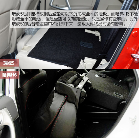 后備箱空間,瑞虎5由于整車沒有H6長,同時(shí)后備箱開口太高,固定后備箱容積不及哈弗H6。兩車后排座椅都可以4/6比例放倒,空間拓展性較好。瑞虎5后排座椅放倒后坐墊可以下沉形成全平的地板。而哈弗H6不能形成全平的地板,但是坐墊可以向前翻起,只是操作有些麻煩。另外瑞虎5的后備箱遮物簾不能卸下來,裝載大件物品時(shí)會(huì)有影響。