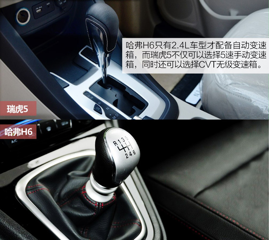 雖然哈弗H6動力選擇更加豐富,但是只有2.4L車型才配備自動變速箱是其一大劣勢,其它車型配備的是5速或6速手動變速箱。而瑞虎5 2.0L車型不僅可以選擇5速手動變速箱,同時還可以選擇CVT無級變速箱,在燃油經(jīng)濟性比較有優(yōu)勢。