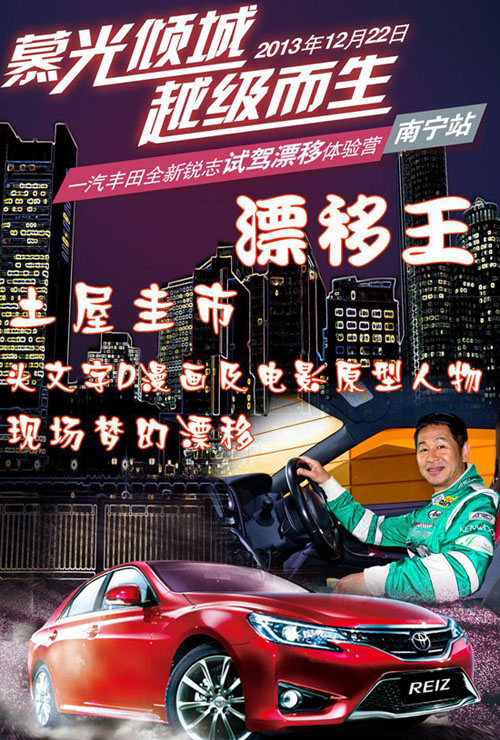 12月22日(周日),“頭文字D”原型人物——漂移之王土屋圭市親臨邕城,駕駛一汽豐田銳志現(xiàn)場暢演花式甩尾、震撼過彎、半失控速度與激情等巔峰漂移特技,南寧的觀眾將首次在家門口觀賞國際頂級漂移盛宴!另外,活動現(xiàn)場一汽豐田全系專項優(yōu)惠,購車更享專屬定制好禮。