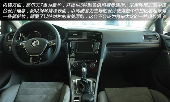 內(nèi)飾方面,高爾夫7比起高爾夫6更為豪華,并提供3種顏色供消費(fèi)者選擇。高爾夫7采用了環(huán)抱式的中控臺(tái)設(shè)計(jì)理念,配以鋼琴烤漆表面,以駕駛者為主導(dǎo)的設(shè)計(jì)使得整個(gè)中控區(qū)看起來(lái)有一些傾斜狀,顛覆了以往對(duì)稱的審美原則,這會(huì)不會(huì)成為將來(lái)大眾的一種趨勢(shì)呢?