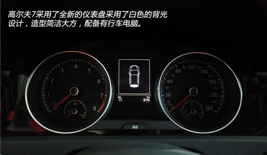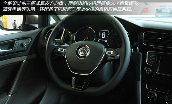 高爾夫7采用了全新的儀表盤(pán)采用了白色的背光設(shè)計(jì),造型簡(jiǎn)潔大方,配備有行車電腦。全新設(shè)計(jì)的三幅式真皮方向盤(pán),兩側(cè)功能按鈕面板集成了音量調(diào)節(jié)、藍(lán)牙電話等功能,還配備了同級(jí)別車型上少見(jiàn)的自適應(yīng)巡航系統(tǒng),黑色烤漆的板面材質(zhì)提升了駕駛者的尊貴感受。
