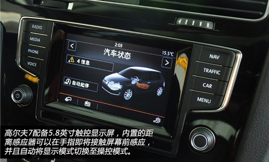 高爾夫7配備了大眾全新的MIB模塊化信息娛樂(lè)系統(tǒng),配備5.8英寸觸控顯示屏,內(nèi)置的距離感應(yīng)器可以在手指即將接觸屏幕前感應(yīng),并且自動(dòng)將顯示模式切換至操控模式。高配車型配備了雙區(qū)恒溫自動(dòng)空調(diào),以及全新采用的電子剎車和AUTO HOLD功能。
