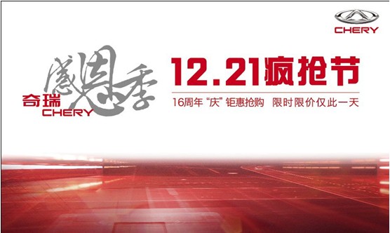12月21日,奇瑞瘋搶“節(jié)”火熱來襲!值此建廠16周年慶典之際,感恩回饋大狂歡,底價(jià)鉅惠搶不停!新QQ、風(fēng)云2、瑞虎3多款經(jīng)典車型火熱搶購,突破底價(jià),力呈重磅優(yōu)惠!活動(dòng)當(dāng)天凡進(jìn)店即有精美禮品,購車即可享受超低價(jià)格,限時(shí)搶購僅此一天,先到先得,不容錯(cuò)過!詳詢:0771-3222566/3222599 400-922-0771轉(zhuǎn)8002 奇瑞汽車廣西鑫廣達(dá)旗艦店地址:南寧市高新區(qū)科園大道55號(hào)鑫廣達(dá)汽車城內(nèi)