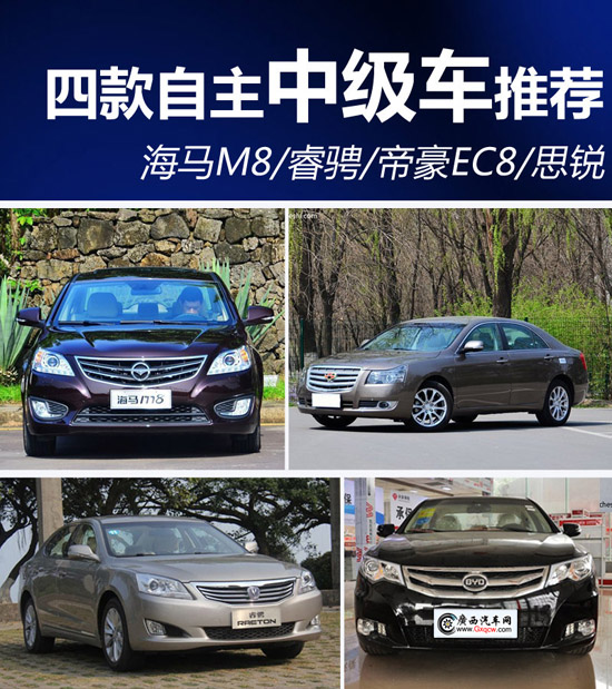剛剛上市的海馬M8只有2.0L一款動(dòng)力,表面上看12.68萬(wàn)元的起步價(jià)稍高,但看看配置清單就會(huì)發(fā)現(xiàn)物有所值,全系標(biāo)配ESP、坡道輔助、電動(dòng)天窗、座椅加熱、雙區(qū)自動(dòng)空調(diào)等等;睿騁有2.0L與1.8T兩款動(dòng)力,整體做工優(yōu)秀原創(chuàng)度高;帝豪EC8提供2.0L、2.4L兩款動(dòng)力,而思銳則采用1.5T渦輪增壓引擎。