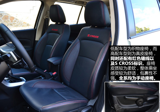 坐進(jìn)鋒馭的駕駛席,高高的坐姿和良好的視線(xiàn)讓你不由自主的對(duì)這輛車(chē)的通過(guò)性充滿(mǎn)信心。低配車(chē)型為織物座椅,而高配座椅為真皮座椅,同時(shí)配有紅色縫線(xiàn)以及S.CROSS標(biāo)識(shí),座椅皮質(zhì)柔軟軟,整體乘坐感較為舒適,包裹性不強(qiáng),全系均為手動(dòng)調(diào)節(jié)。