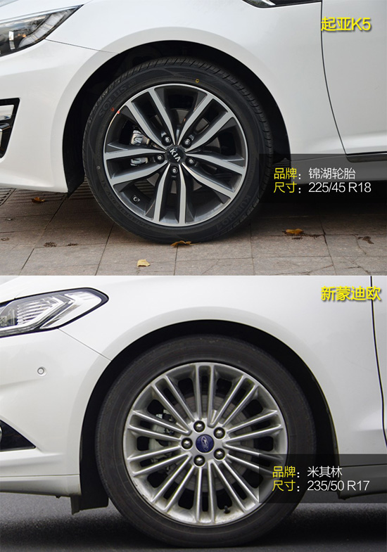 起亞K5采用的是錦湖輪胎,尺寸為225/45 R18,相比之下,新蒙迪歐的輪胎尺寸小了一號,為235/50 R17,品牌是米其林。另外,K5裝配的是全尺寸備胎,而新蒙迪歐為非全尺寸設(shè)計。