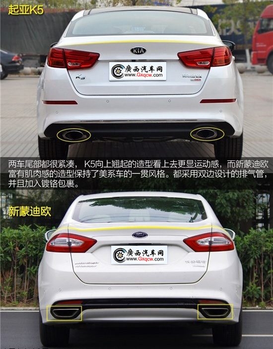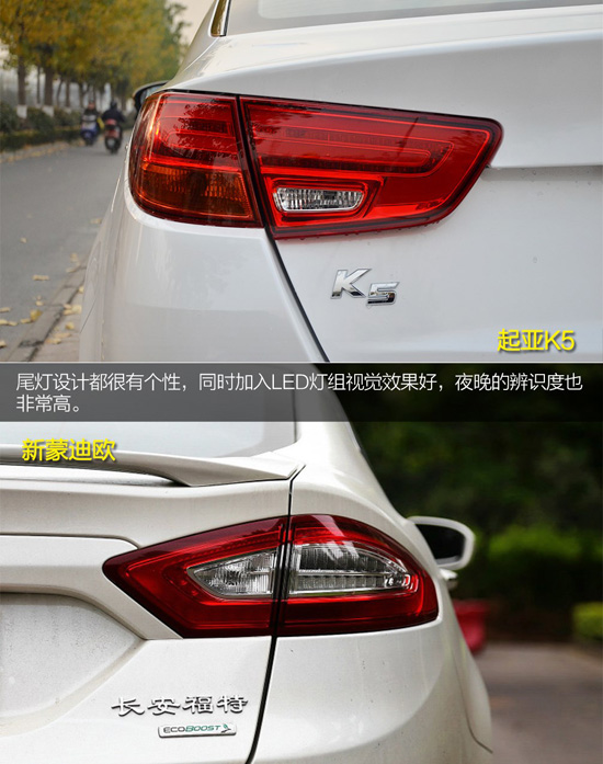 兩車尾部都很緊湊, K5向上翹起的造型看上去更顯運動感,而新蒙迪歐富有肌肉感的造型保持了美系車的一貫風(fēng)格。都采用雙邊設(shè)計的排氣管,并且加入鍍鉻包裹。
