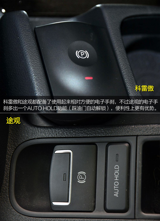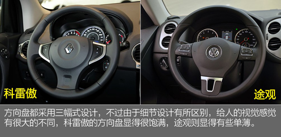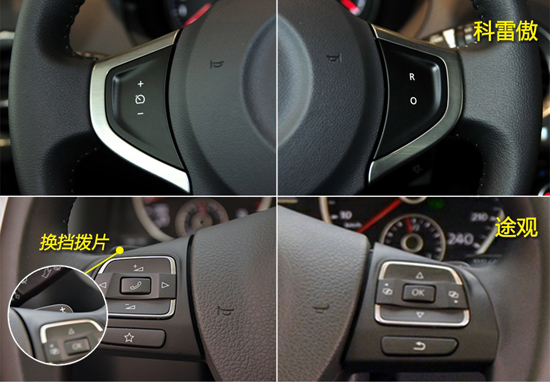 兩款車的多功能功按鍵集成的功能都差不多,不過途觀的高配車型配備了換擋撥片,而科雷傲沒有配備,在駕駛樂趣上途觀有一定優(yōu)勢。