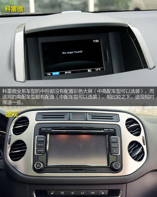 科雷傲和途觀的內(nèi)飾屬于完全不同的風(fēng)格,前者的設(shè)計非常個性,尤其是中控臺,非常寬大,而且?guī)в幸欢ǖ幕《龋梢詼p少光線對駕駛員的影響。而途觀的內(nèi)飾設(shè)計非常中庸,但由于設(shè)計合理,看久了也不會有審美疲勞。