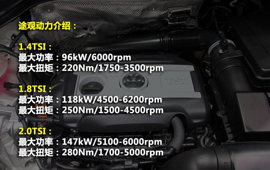 途觀搭載了三款排量發(fā)動機,也都是無論增壓車型,含蓋了1.4T、1.8T、2.0T三種不同排量,滿足不同人群的需要。