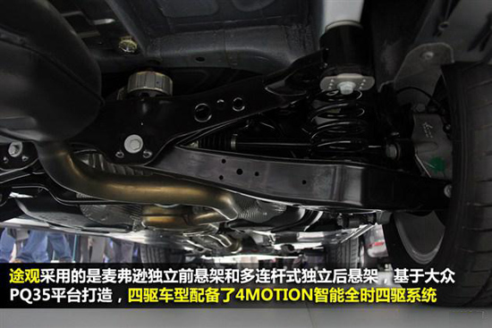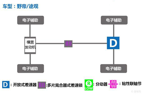 關(guān)于兩車四驅(qū)系統(tǒng):其實兩車的四驅(qū)結(jié)構(gòu)在本質(zhì)上是相同的,均為城市SUV多采用的適時四驅(qū)系 統(tǒng),中央差速器都采用了主流的電控多片離合器,其中前后橋為開放式差速器,四個車輪帶有電子輔助制動,前、后輪的動 力分配比理論上極限值也僅為50:50,在極端環(huán)境下并不能實現(xiàn)完全鎖止。其中野帝僅1.8T車型提供四驅(qū)版車型, 而途觀的四驅(qū)系統(tǒng)同樣未裝配在1.4T車型上。