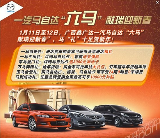 1月11日至12日,廣西鑫廣達(dá)一汽馬自達(dá)“一馬當(dāng)先送好禮 六馬獻(xiàn)瑞度新春”,馬“禮”十足給邕城百姓送上新春大禮!