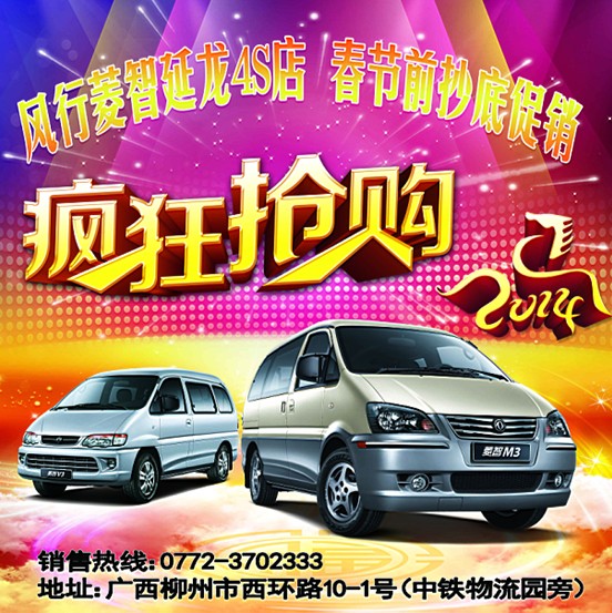 風行菱智柳州西環(huán)路延龍專營店,值此2014春節(jié)之際,店頭聯(lián)合廠家進行一次大型促銷活動,廠家促銷時間2014年1月15日開始,截止2014年1月30日結束。