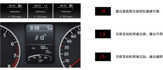 另外,全新捷達(dá)還具備換擋提示功能,可以提示駕駛員最佳的換擋時(shí)間。這個(gè)功能并非簡(jiǎn)單的當(dāng)前擋位提示,它還具備升降擋的提示功能。當(dāng)車(chē)輛的轉(zhuǎn)速和擋位搭配正確時(shí),行車(chē)電腦就會(huì)顯示當(dāng)前的擋位,比如說(shuō)車(chē)輛以3擋行駛,那么行車(chē)電腦就會(huì)顯示“3”;如果車(chē)輛以低速高擋或高速低擋行駛,那么行車(chē)電腦就會(huì)出現(xiàn)升降擋的提示。有效解決了駕駛員不合理?yè)Q擋導(dǎo)致的高油耗,同時(shí)更解決新手駕駛員的換擋難題。
