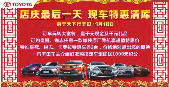 時值歲末,新春佳節(jié)來臨之際,您是否還在為選不到愛車而發(fā)愁?南寧天下行豐田店慶1月18日最后一天現(xiàn)車放價清庫,鉅惠銷售,讓您年前輕松買車!
