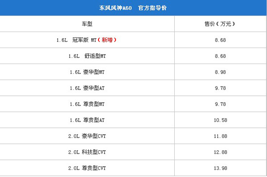 東風(fēng)風(fēng)神A60冠軍版車型近日上市,新車在現(xiàn)有的1.6L手動舒適型的基礎(chǔ)上增添了一些配置,售價不變。
