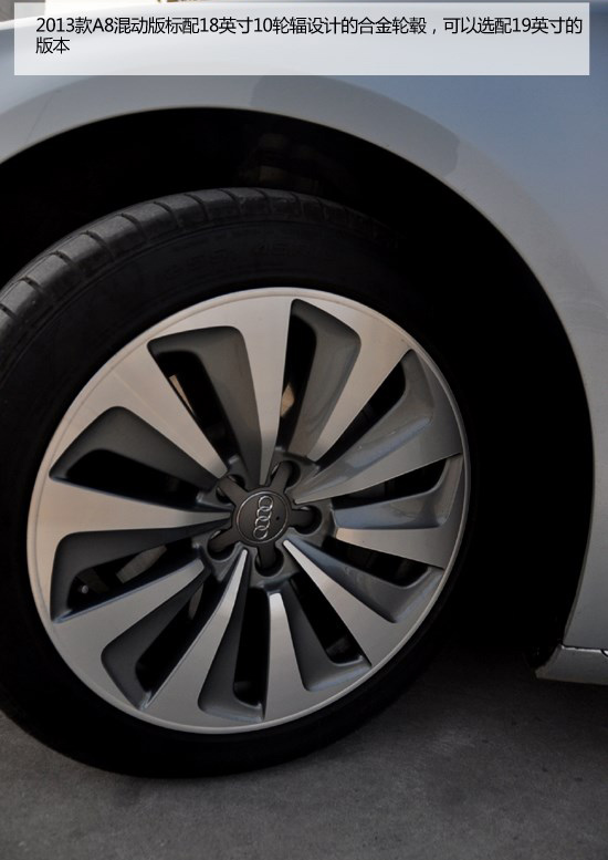 2013款A(yù)8混動版標(biāo)配18英寸10輪輻設(shè)計的合金輪轂,可以選配19英寸的版本。