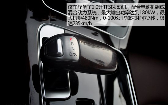 該車配備了2.0升TFSI發(fā)動(dòng)機(jī),配合電動(dòng)機(jī)組成混合動(dòng)力系統(tǒng),最大輸出功率達(dá)到180kw,最大扭矩480Nm,0-100公里加速時(shí)間7.7秒,極速235Km/h。這樣出色的動(dòng)力數(shù)據(jù)每百公里只需消耗6.3L汽油。該車在全電動(dòng)條件下能以每小時(shí)60公里的速度行駛3公里。