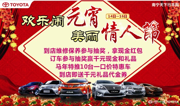當(dāng)情人節(jié)遇上元宵節(jié),這個雙節(jié)注定是美麗的,也是歡樂的!雙節(jié)歷經(jīng)數(shù)十年,終于相遇,這也預(yù)示著2014年馬年幸運連連。在這個雙節(jié)的喜慶日子里,南寧天下行豐田于2月14日-16日三天期間傾情奉獻(xiàn)雙節(jié)歡樂PARTY活動。