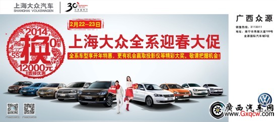 玩大的!上海大眾迎春大促就在本月22-23日秀廂大道199號金源國際汽車城廣西眾源;顒觾商焐虾4蟊娙弟囆拖黹_年特惠價(優(yōu)惠不止一點點!),屆時,Polo、全新桑塔納、新帕薩特等諸多上海大眾暢銷車型優(yōu)惠將大幅提高,有購車意向的朋友們一定要把握好購車良機(jī)。另外,活動當(dāng)天購車朋友還可以現(xiàn)場參與幸運飛鏢游戲環(huán)節(jié)贏取投影儀、高級座墊、整理箱、車用凈化器等繽紛大獎,100%中獎。